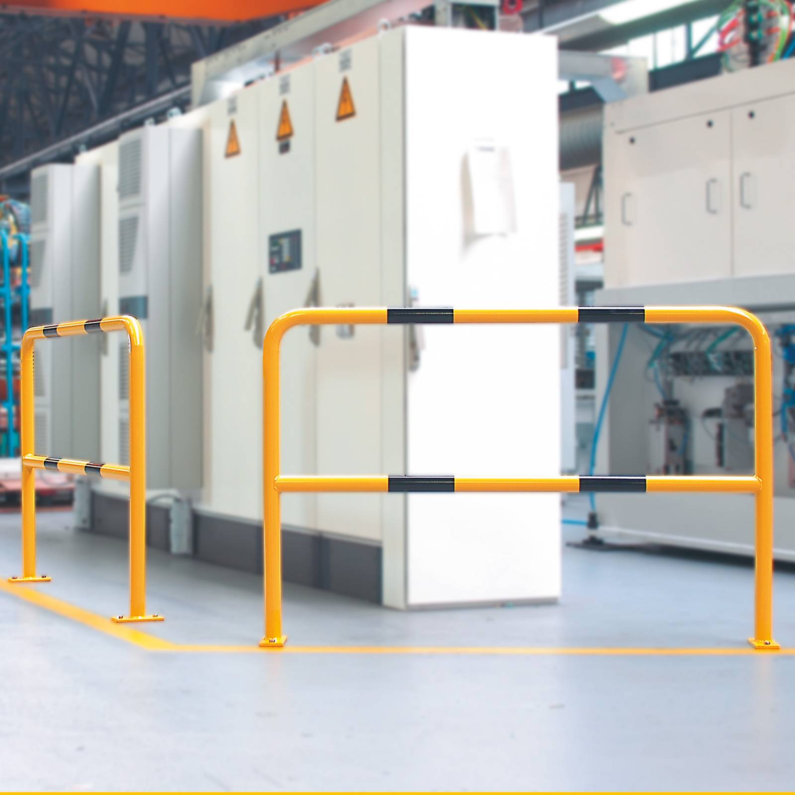 Barandilla industrial de seguridad peatonal en acero lacado, y acero galvanizado lacado para exterior. Guía y resguarda el tránsito peatonal, separa espacios y crea perímetros de seguridad impidiendo el paso directo de carretilas, transpaletas, montacargas y otros vehículos industriales.