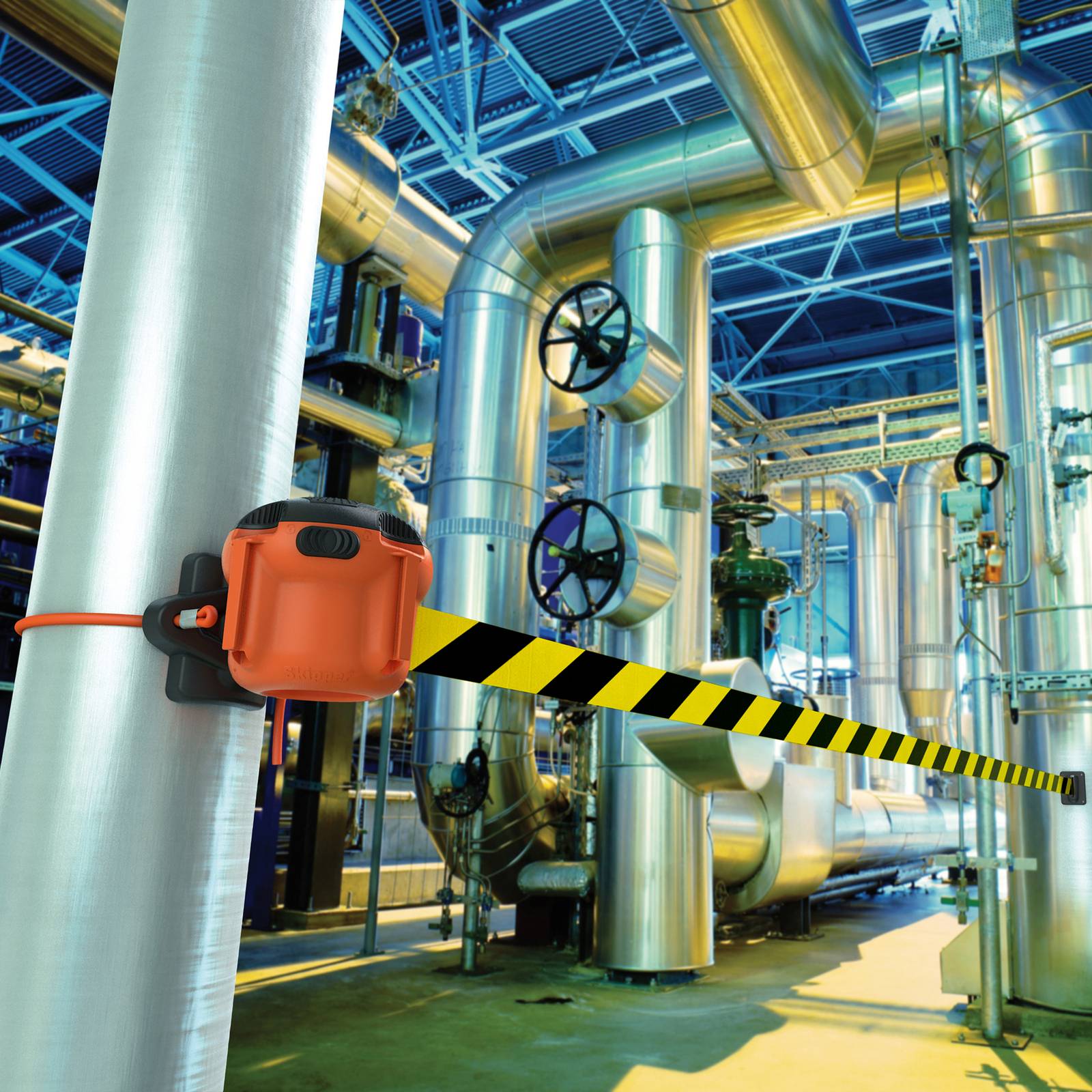 Carrete con cinta extensible retráctil de cosido muy resistente y durable, para delimitar espacios amplios. Cinta de 9 metros de longitud, autotensable, con botón de bloqueo que evita que la cinta se retractile por accidente.