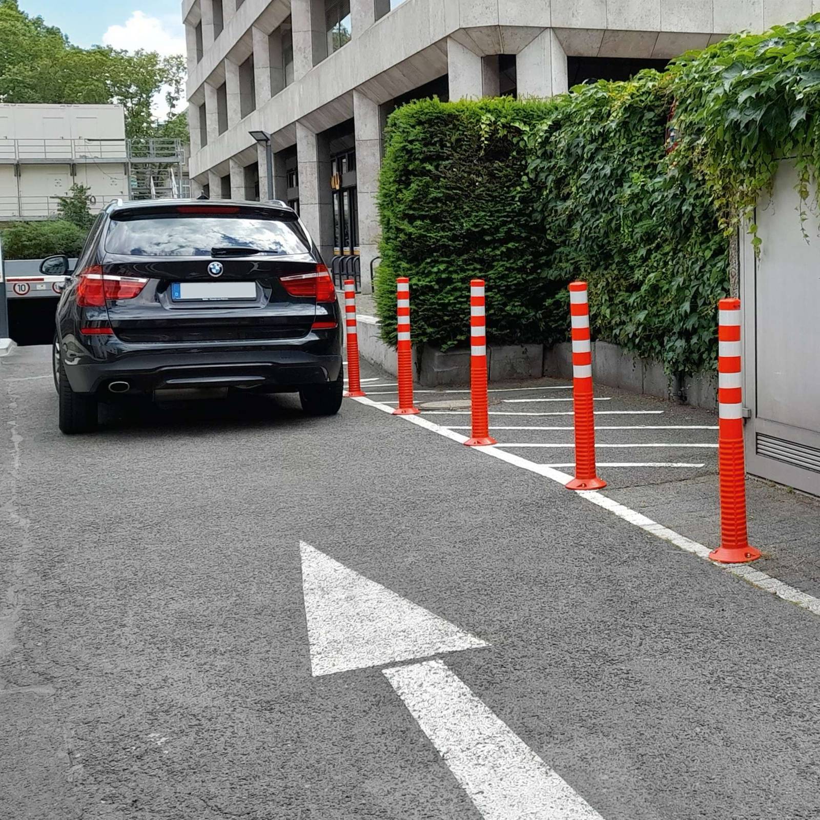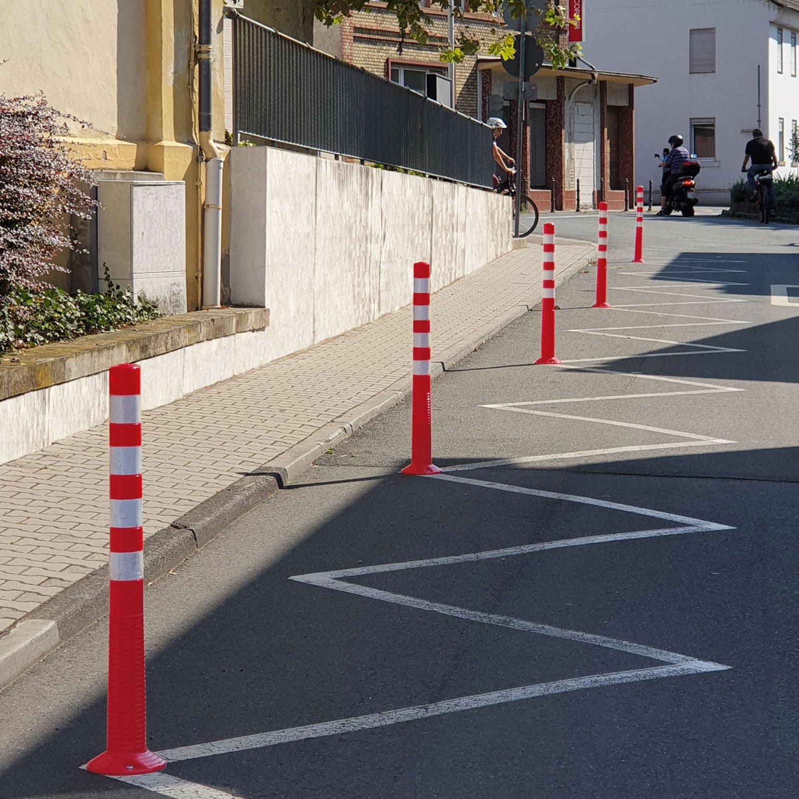 Hito flexible reflectante con cuerpo de una sola pieza en polímero flexible, equipado con bandas blancas reflectantes de alta visibilidad y brillo que reflejan la luz al ser iluminadas. Tras el impacto recupera su forma original sin perder propiedades.