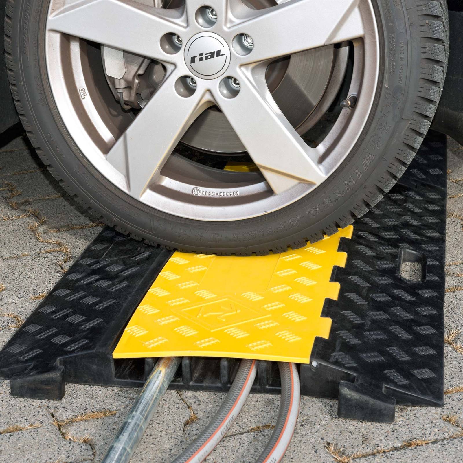 Rampa pasacables para suelo con 5 canaletas que protege cables, tubos o mangueras del paso de vehículos. Soporta un peso de hasta 8 t por eje. La mezcla usada de goma y caucho, proporciona una elevada resistencia a la abrasión y es adecuada para vehículos pesados.
