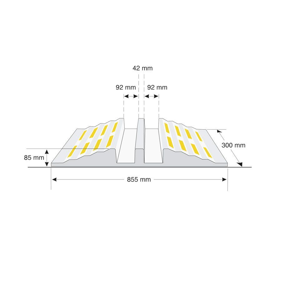 Rampa pasatubos que salvaguarda cables, tubos, mangueras y otros conductos de hasta 75 mm de diámetro, de ser dañados por el tránsito de vehículos. Fabricada en caucho reforzado, resistiendo eficazmente el paso de todo tipo de vehículos, pesados inclusive.